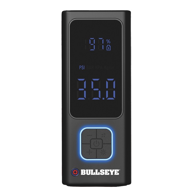 Compact and powerful tire 7.4-volt inflator can also charge your phone or other devices on the go. Easy-to-read LED display shows tire pressure and battery life, and the auto shut-off feature stops inflation at the preset pressure. Handles tires up to a maximum PSI of 100, making it great for cars, motorcycles, bikes, and sports equipment. Includes 6" air hose, 2 nozzle adapters, 1 sports needle for items like balls and inflatables, charging cord and storage bag. Uses C battery (not included). 7"L x 2.5"W x 1.75"D.