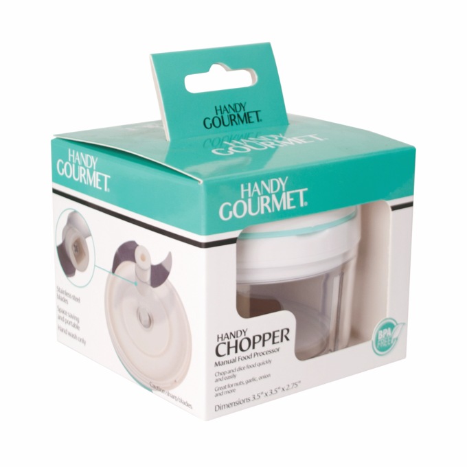 This compact and space-saving kitchen companion, featuring stainless steel blades, is perfect for chopping vegetables, garlic, nuts, and more. 3/4-cup capacity. 3.5" x 3.5" x 3".